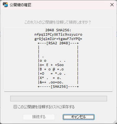 また、キーリストをダブルクリックすると接続時に確認されるホスト鍵の指紋を見ることが出来ます。同じサーバーアドレス・ポート番号で複数の鍵がある場合は、暗号方式などの設定で希望のホスト鍵を利用して接続することができます |
