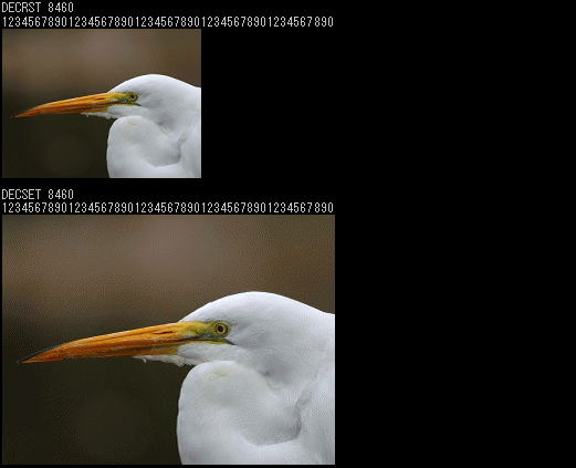 2.31.0以前は、フォントサイズ(画面サイズ)からSixel画像の表示サイズを計算して実画像サイズで表示するようにしていましたが、多くの端末では、固定値の10ピクセルで計算して画像サイズを文字数で簡単に計算できるようにしています。横300pixの場合は、300pix/10pix=30文字で表すことになりフォントサイズに依存せずに表示画像サイズを拡大、縮小して表示します |